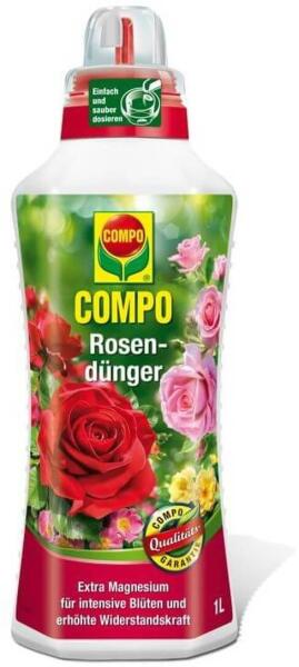 Compo rózsa tápoldat 1000 ml A Compo rózsa tápoldat egy speciális tápanyag kombináció futó- és állórózsák számára. Azonnali hatással stimulálja a gyökérnövekedést és a biztosítja a növény optimális növekedését. Rózsák átültetéséhez ajánljuk a Compo Sana rózsaföldet. Az extra magnézium az intenzív virágzásért felel és ellenállóbbá teszi a növényt különböző betegségekkel szemben. Összetétele: Összes nitrogén: 7% N, nitrát nitrogén: 2,9% N, ammónium-nitrogén: 2,7%, urea nitrogén: 1,4%. Vízoldható foszfor-pentoxid (P2O5): 5% (P = 2,2%). Vízoldható kálium-oxid (K2O) 6% (K = 5%). Vízoldható bór (B): 0,01%. Vízoldható réz (Cu): 0,002% Vízoldható vas (Fe): 0,02% Vízoldható mangán (Mn): 0,01% Vízoldható molibdén (Mo): 0,001%. Vízoldható cink (Zn): 0,002%  Felhasználása:Márciustól októberig hetente egyszer érdemes használni. Compo termékek kupakjai adagolóként is alkalmazhatóak. 1,2, 3 és 5 liter vízhez szükséges tápoldat mérését tudjuk elvégezni.